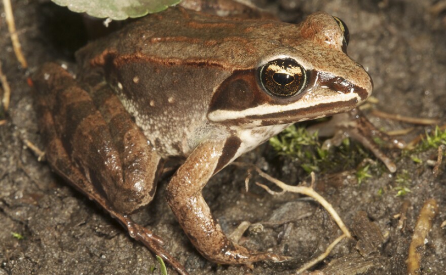 They vary in skin color from brown tan green and gray. Wood Frog Lithobates sylvatica The Wood frog looks like it has a mask around its eyes like a cartoon character thief. Also the tree frog sound can be like a metallic buzz.